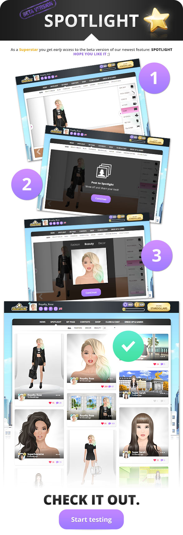 Przeglądając dziś swoją Stardoll'ową pocztę, zobaczyłam wiadomość, że jako SS mogę skorzystać z nowej funkcji o nazwie Spotlight. Jeśli dobrze kojarzę, jakiś czas temu możliwość ta została zaoferowana tylko Royalty. Sam sposób działania tej nowości, polega to na tym, że przesyłamy zdjęcie naszej doll, a inni użytkownicy mogą je komentować lub też "serduszkować". Zdjęcia ukazują się w nowej zakładce, którą już pewnie większość zauważyła, ponieważ mieści się między "News'ami", a "Moją stroną". Fotki podzielone są na trzy kategorie: moda, piękno i dekor. Możemy przesyłać jedno zdjęcie dziennie, do wybranej przez nas kategorii.